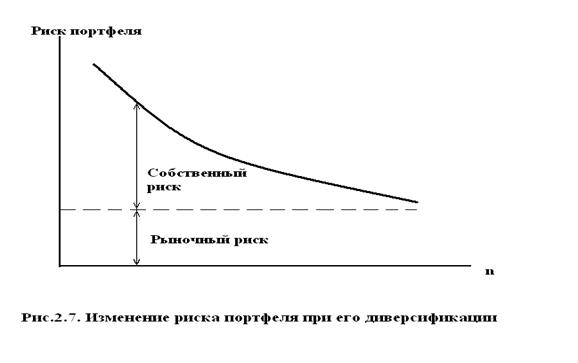 Первое слагаемое в (2.20) характеризует рыночный (систематический, недиверсифицируемый) риск, а второе — собственный риск портфеля, который может быть уменьшен за счет диверсификации как показано на рис.2.7.