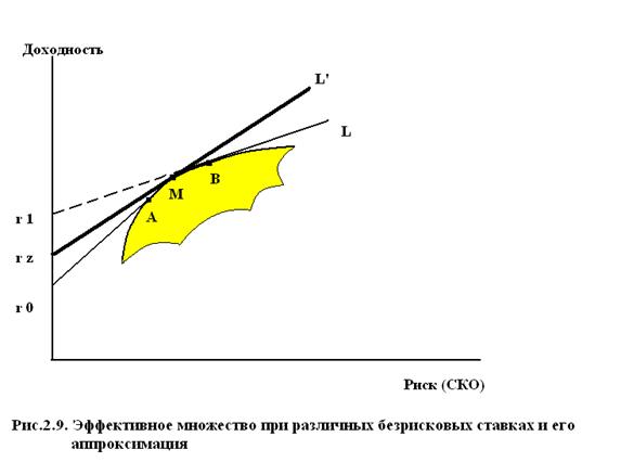 , участок АВ — это участок эффективного фронта Марковица, а прямая BL означает получение кредита по ставке