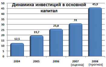Инвестиции в основной капитал за счет всех источников финансирования в 2009 году прогнозируются в размере 56,3 млрд. рублей и возрастут к оценке 2008 года на 18,8%. В 2011 году темп роста инвестиций к отчету 2007 года, по прогнозу, составит 182,3%.