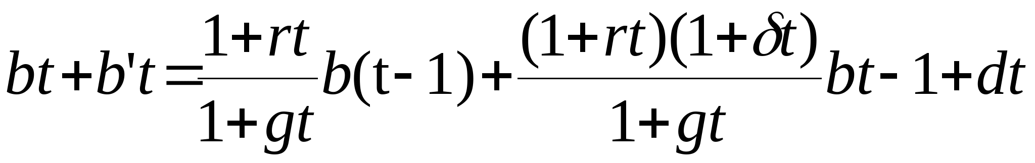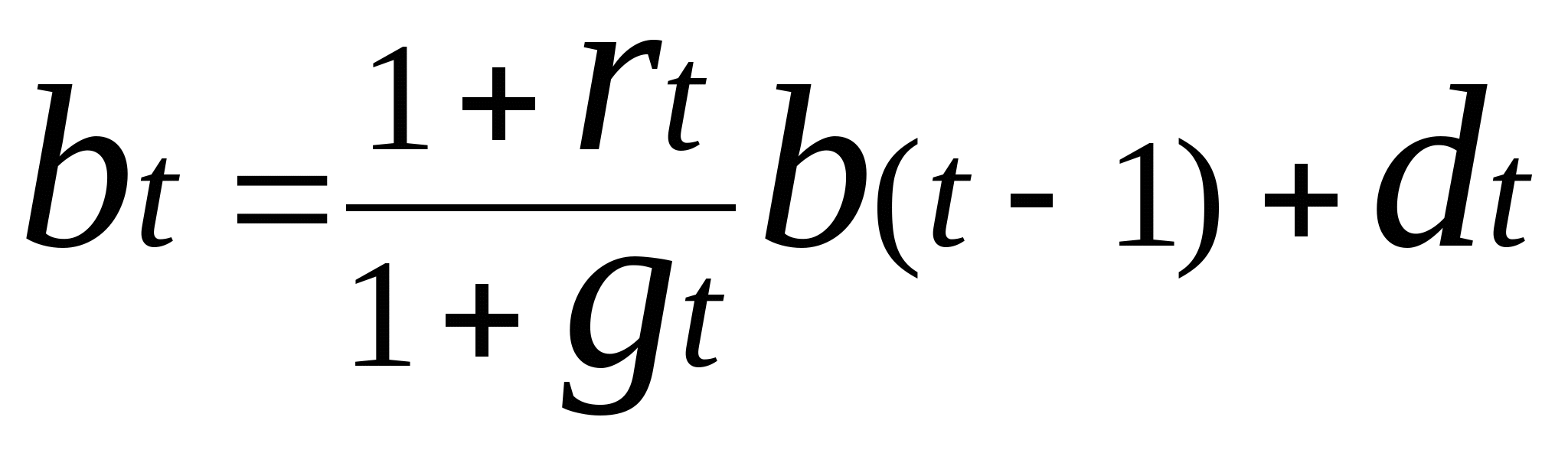 правление реальной динамикой долговых обязательств предполагает контроль за двумя важнейшими показателями – величиной государственного долга и стоимостью его обслуживания. В условиях экономического роста важны не абсолютные их размеры, а доля государственного долга в ВВП и соотношение реального процента (стоимости обслуживания за вычетом инфляционной составляющей) и темпа экономического роста. Это нетрудно показать, если представить процесс накопления долга в виде следующего уравнения: