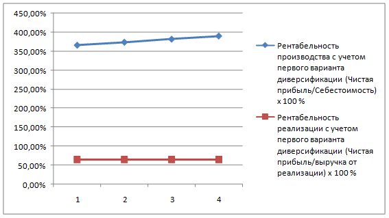 Графики рентабельности производства и реализации по первому варианту диверсификации