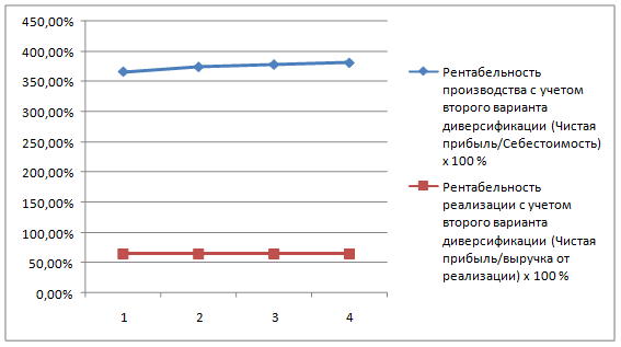 | 3 | Рентабельность производства с учетом второго варианта диверсификации (Чистая прибыль/Себестоимость) х 100 % | 366,06% | 374,18% | 378,33% | 381,37% |