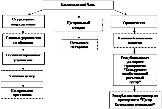 Национальный банк — это единая централизованная организация. В ее состав входят центральный аппарат, структурные подразделения и организации, находящиеся на территории Республики Беларусь и за ее пределами. Работа структурных подразделений и организаций Национального банка осуществляется на основании уставов, утверждаемых в порядке, установленном Уставом Национального банка. Для выполнения приходно-расходных кассовых операций во всех учреждениях эмиссионного банка организуются оборотные кассы.