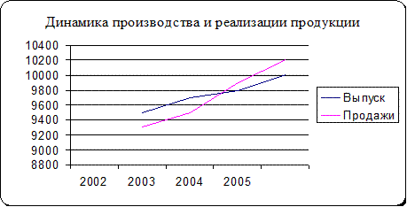 Из таблицы видно, что за 4 года объем производства возрос на 5,3%, а объем реализации — на 9,7%. То, что за 2005 год темп выпуска продукции ниже темпа продаж, говорит о том, что нереализованная продукция на складах предприятия и неоплаченная покупателями в предыдущие года реализована в 2004 году в связи с ростом спроса на продукцию нашего предприятия.
