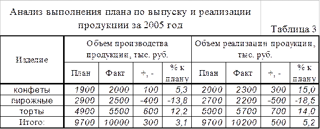 Если анализировать по видам кондитерских изделий, то фактический выпуск конфет в отчетном году по сравнению с планом увеличился на 100 тыс. руб. (что составило 5,3%), а реализация на 300 тыс. руб. (15%); тортов: выпуск — на 600 тыс. руб. (12,2%), продажа — также на 700 тыс. руб. (14%); выпуск пирожных по сравнению с планом уменьшился на 400 тыс. руб. (13,8%), на что повлияло понижения спроса на данный вид продукции в предыдущих периодах, но это не предотвратило снижения уровня продаж на 500 тыс. руб. (18,5%).