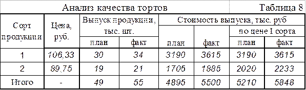 Выполнение плана по качеству рассчитывается как отношение фактического коэффициента сортности к плановому и составляет 100,1%. Это значит, что план по качеству продукции, а именно тортов, перевыполнен только на 0,1%.