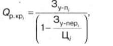 Умножив Ккp на d , получим то количество единиц этого товара (работы, услуги), которое надо изготовить для обеспечения безубыточности работы предприятия при принятой в расчете структуре выпуска продукции (работ, услуг). Объем производства продукции (работ, услуг) предприятия в стоимостном выражении, обеспечивающий его безубыточную работу, Qпр.кр определяют по формуле