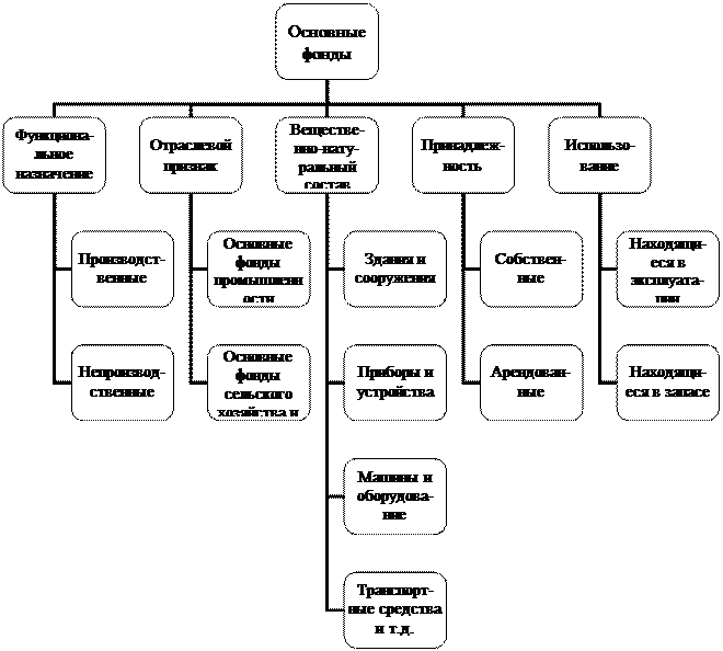 Неоднородность основных фондов по натуральному вещественному составу и предназначению для процессов производства обусловливает необходимость их классификации, они делятся на следующие группы: здания, сооружения, рабочие и силовые машины и оборудование, измерительные и регулирующие приборы и устройства, вычислительная техника, транспортные средства, инструмент, производственный и хозяйственный инвентарь и принадлежности, рабочий, продуктивный и племенной скот, многолетние насаждения, внутрихозяйственные дороги и прочие соответствующие объекты.