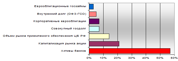 По оценкам, объем рынка приемлемого обеспечения по операциям пополнения ликвидности Центрального Банка РФ не превышает 13%, что кратно ниже, чем размеры самого банковского сектора. Проблема в том, что размер финансовых рынков столь мал, что даже если ЦБ РФ исчерпает весь список доступных рыночных инструментов, коммерческие банки будут ис