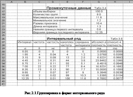 Результаты группировки оформляются в виде таблицы распределения значений совокупности по интервалам (табл. 2.1).