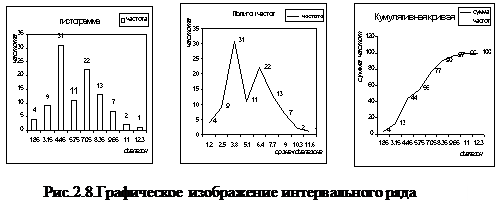 , моды MO, медианы ME и характера рассеивания значений дисперсии d2 и среднеквадратичного отклонения d интервальные ряды изображают графически. Для этого строятся следующие диаграммы — гистограмма, полигон частот и кумулятивная кривая.