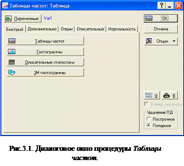 Для выполнения группировки в системе Statistica из стартовой панели Описательные статистики и таблицы выбирается процедура Таблица частот. По этой команде открывается одноименный диалог рис.3.1, в котором произведем следующие установки: