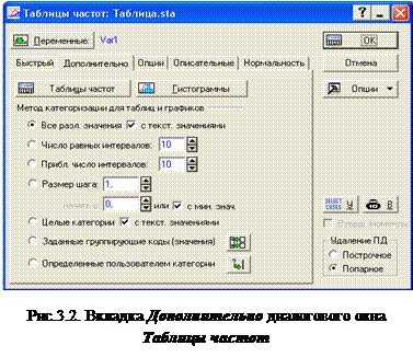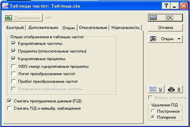 ГруппаОпции отображения в таблицах частот определяет статистики, которые вычисляются для каждой категории в Таблицах частот. В зависимости от выбора в поле Удаление ПД STATISTICA включает ПД в обработку, или исключает их из нее.