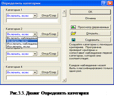 При нажатии кнопки Определенные пользователем категории вызовается диалоговое окно Определить категории рис.3.3. Диалоговое окно позволяет вам задать до 16 условий выбора наблюдений для использования их в вычислениях таблиц частот (разбиения наблюдений на категории). Заданные здесь условия выбора будут проверены последовательно; т.е. наблюдение попадет в первую категорию, к которой он «подходит».