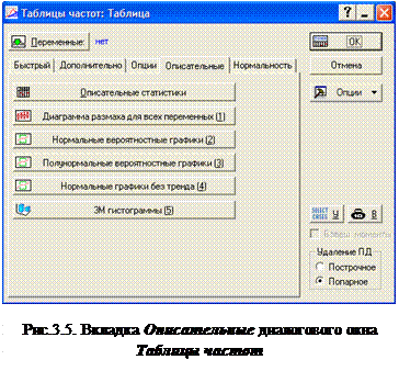 Опции этой вкладки рис.3.5 служат для просмотра набора статистик и графиков распределений для каждой из выбранных переменных.