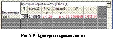 При нажатии на Критерий нормальности вкладки Нормальность – на экран выводятся таблицы результатов со значениями критериев нормальности рис.3.9.