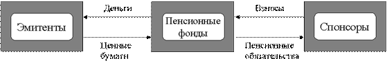 Пенсионные фонды (в том числе и пенсионные планы) – это финансовые учреждения, которые эмитируют пенсионные обязательства взамен пенсионных взносов от частных и юридических лиц и вкладывают полученные деньги в финансовые инструменты (см. рис.1).