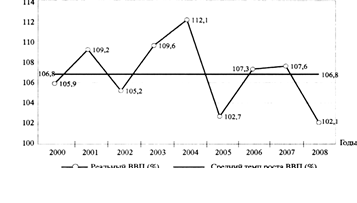 Проявления глобального кризиса в Украине усилены реализацией макроэкономических и финансовых рисков, накопленных в годы экономического роста. Как видно из рисунка 1, экономический рост в 2000—2008 гг. имел неустойчивый характер, что свидетельствует об отсутствии важных компонентов рыночной системы, таких как гибкий и развитый внутренний рынок, способный компенсировать неблагоприятные колебания внешней конъюнктуры, фондовый рынок. Медлительность в проведении структурных и институциональных реформ, неразумная бюджетная политика обрекали украинскую экономику на глубокий кризис эндогенного происхождения. Экзогенный фактор мирового финансового кризиса спровоцировал одновременную реализацию большой доли рисков, накопленных за годы несбалансированного и неустойчивого роста.