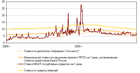 В IV квартале 2009 г. уровень ставок по межбанковским кредитам (МБК) на российском денежном рынке продолжал снижаться. Этому способствовали понижение процентных ставок по операциям Банка России и увеличение объема ликвидных рублевых средств кредитных организаций. Средняя ставка по размещенным российскими банками рублевым МБК сроком на 1 день снизилась с 7,1% годовых в III квартале 2009 г. до 5,5% годовых в IV квартале. Ставка MIACR по однодневным рублевым МБК на протяжении всего IV квартала колебалась в диапазоне от 4,0 до 7,1% годовых (в III квартале — от 5,9 до 8,6% годовых).