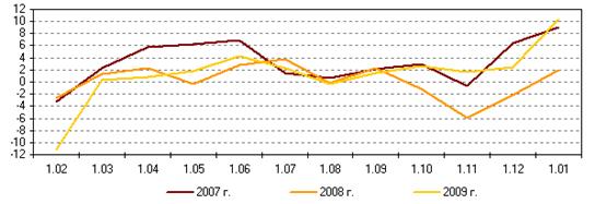 Стабилизация ситуации на внутреннем валютном рынке способствовала снижению девальвационных ожиданий. С апреля 2009 г. наметилась тенденция к снижению инфляции и инфляционных ожиданий. В то же время, несмотря на принимаемые Банком России меры по увеличению предоставления рублевых средств кредитным организациям, стоимость кредитных ресурсов оставалась на высоком уровне. Значительное сокращение как предложения кредитов со стороны банковского сектора, так и спроса на кредиты со стороны экономических агентов обусловило сокращение в феврале-сентябре 2009 года общей задолженности по кредитам, выданным кредитными организациями. В апреле-октябре 2009 года восемь раз снижались процентные ставки. За этот период ставка рефинансирования была снижена с 13 до 9,5% годовых, а ставки по операциям Банка России – на 2,25‑3,75 процентного пункта. Изменение процентных ставок по операциям Банка России оказало влияние на снижение краткосрочных ставок рынка межбанковских кредитов. [18, с. 10-19]