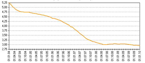 Среднемесячная ставка MIACR по однодневным рублевым кредитам в октябре составила 5,8% годовых, в ноябре — 5,3% годовых. В декабре, несмотря на увеличение волатильности номинального курса рубля по отношению к ведущим мировым валютам, среднемесячная ставка MIACR по однодневным рублевым кредитам продолжала снижаться и составила 5,1% годовых.