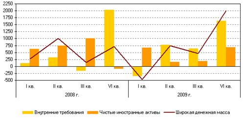 Широкая денежная масса за январь-сентябрь 2009 года, по предварительным данным, увеличилась на 4,5%. Годовой темп прироста широкой денежной массы на 1.10.2009 составил 9,1%. Основным источником роста широкой денежной массы было увеличение внутренних требований. В IV квартале 2009 г. чистые иностранные активы банковской системы возросли на 5,1%, а внутренние требования — на 13,9% (за аналогичный период предыдущего года — сократились на 0,6% и увеличились на 23,6% соответственно). В целом за 2009 г. внутренние требования возросли на 25,4%, а чистые иностранные активы — на 13,9% (за 2008 г. — на 27,9 и 23,2% соответственно). При этом наиболее существенный вклад в прирост внутренних требований внесло увеличение чистого кредита к органам государственного управления.