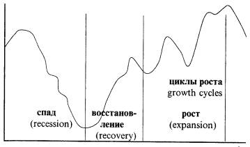 Современные западные экономисты рассматривают структуру экономического цикла, выделяя следующие фазы: подъем и пик, сокращение и спад, где пик – вершина подъема производства, а спад – низшая точка его падениям.