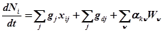 . Изменение числа молей i-того компонента в системе за единицу времени определяется потоками вещества и протекающими в системе химическими реакциями:
