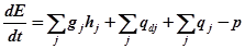 за единицу времени определяется потоками энергии вносимой и уносимой вместе с конвекционными потоками вещества, изменением энергии за счёт диффузионного обмена веществом, потоками тепла (за счёт теплопроводности, переноса излучением, хим. реакции):