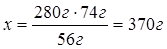 Дано: m(CaO)=280 г H2 O | 280 г х г CaO + H2 O = Ca(OH )2 1 моль 1 моль 56 г/моль 74 г/моль 56 г 74 г 1. Определяем массу кальций гидроксида 280 г: 56 г = х: 74 г