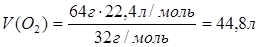 | Ответ: | 64г кислорода занимает объём 44,8 л. |
