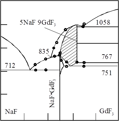 Лантаноиды во фторидных расплавах образуют устойчивые трехвалентные комплексы типаMeI MeIII F4 (MeI — Li, Na, K) и MeI3 MeIII F6 (MeI – K, Rb, Cs, NH4 ). Несколько лет назад Тома предсказал, что если отношение радиусов катионов Ме+ / Ме3+ находятся в интервале 0,77 – 1,4, комплексы типа МеI GdF4 могут существовать, а если Ме+ / Ме3+ >1,43, то будет образовываться конгруэнтно плавящиеся комплексы типа Ме3I GdF6 .