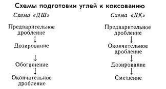 В России широкое распространение получили две схемы подготовки углей к коксованию: схема «ДШ» (дробления шихты) и схема «ДК» (дробления компонентов). Выбор схемы подготовки углей зависит, прежде всего, от качества применяемых для приготовления шихты углей и от имеющегося на предприятии технологического оборудования.