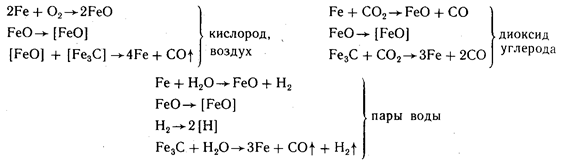 Изменение состава металла в результате газовой коррозии. Если образование оксидного слоя при высокой температуре сопровождается интенсивной диффузией кислорода внутрь металла, то это приводит к изменению его состава за счет окисления легирующих компонентов. Особенно это заметно на конструкционных сталях, в поверхностных слоях которых происходит окисление углерода — ферритная полоска, образование которой сопровождается потерей прочности, особенно для тонкостенных изделий. Взаимодействие сталей с окисляющими средами можно представить в виде следующих уравнений: