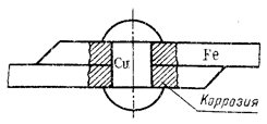 На механизм низкотемпературной коррозии влияет много различных причин: переменная температура и влажность воздуха, переменный состав газовой и электролитной среды и даже бактериальная флора, например при почвенной коррозии, так как некоторые виды бактерий способствуют окислению железа. Развитие коррозии в результате контакта разных металлов можно иллюстрировать схемой, представленной на рис. 1. Наибольшее коррозионное разрушение наблюдается рядом с контактом, так как здесь сопротивление наименьшее и, следовательно, наибольшая плотность тока.