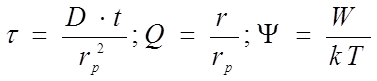 Уравнение (6) совместно с (3) и с соответствующими начальными и граничными условиями описывает эволюцию поля концентраций примесных комплексов С( r ), а приt ® ¥ — равновесное состояние. В случае ограниченного числа частиц граничными условиями являются: на внешней поверхности j=0, на внутренней границе раздела Si—Si02,j= V sC, гдеVs — коэффициент поверхностного массопереноса грани цы раздела кремни й—окисел. Переходя в уравнении (6) к безразмернымпеременным :
