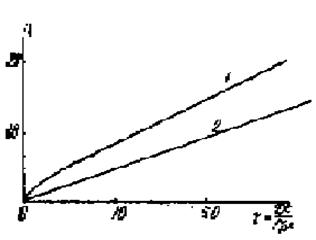 Результаты численного решения уравнения (7) показали, что при больших временах равновесное распределение является предельным для кинетических распределений. Для количественного представления эффективности процесса ВГ на рис. 3 представлена величина h -доля примеси, геттерированной на преципитате, как функция безраз мерного времени. Кривые 1 и 2 описывают эффективность процесса ВГ соответственно с учетом и без учета упругого взаимодействия. Параметр g соответствует здесь относительному линейному несоответствию включения и полости в матрице, в которую он вставлен, равному 0,005, что типично для кислородного преципитата в кремнии, выращенном по методу Чохральского. Из рисунка видно, что дополнительный вклад геттерирования, вследствие упругого взаимодействия сопоставим с величиной геттерирования в отсутствие упругого взаимодействия. При этом процесс ВГ при упругом взаимодействии протекает быстрее .