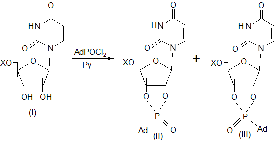 Преображенской и сотрудниками было осуществлено взаимодействие уридина с дихлорангидрином 1-адамантилфосфоновой кислоты в пиримидине. В результате получили неразделимую смесь двух веществ [4]. Дальнейшие исследования показали, по данным ЯМР, масс-спектроскопии и отсутствию подвижности при электрофорезе на бумаге в фосфатно-щелочном (рН 7,7) и боратном (рН 9,2) буферах, полученные соединения являются изомерными цикло-(1-адамантил)фосфонатами уридина (IIa) и (IIIa):