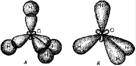 Угол между осями гибридных электронных облаков оказывается равным 109°28', что позволяет им, как одноименно заряженным, максимально удалиться друг от друга. Будучи вытянутыми к вершинам тетраэдра, такие облака могут значительно перекрываться с электронными облаками водородных атомов, что ведет к большему выделению энергии и образованию прочных, одинаковых по свойствам химических связей (рис.1А).
