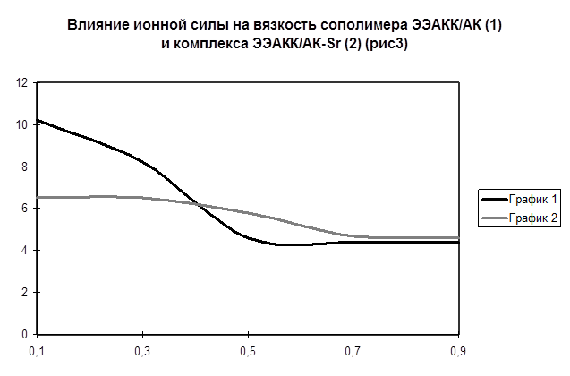 На рис.3 представлено влияние ионной силы на вязкость сополимера ЭЭАКК/АК и комплекса ЭЭАКК/АК-Sr2+. Ионная сила создавалась использованием растворов KCl различной нормальности. При создании ионной силы при всех значениях 0,1; 0,3; 0,5; 0,7; 0,9; полиэлектролитный эффект подавляется поэтому мы имеем значения характерной вязкости (кривая 1). При (1н. раствор KCl) полимер перестает растворяться, выпадая из раствора в осадок в виде белых хлопьев. Кривая (2) отображает поведение полимер-металлического комплекса от ионной силы. При малых значениях вязкость раствора значительно снижена по сравнению с вязкостью сополимера при таком же значении . При дальнейшем увеличении ионной силы вязкость комплекса падает незначительно и не превышает вязкости самого сополимера. Вероятно, ионная сила способствует стабилизации комплекса.