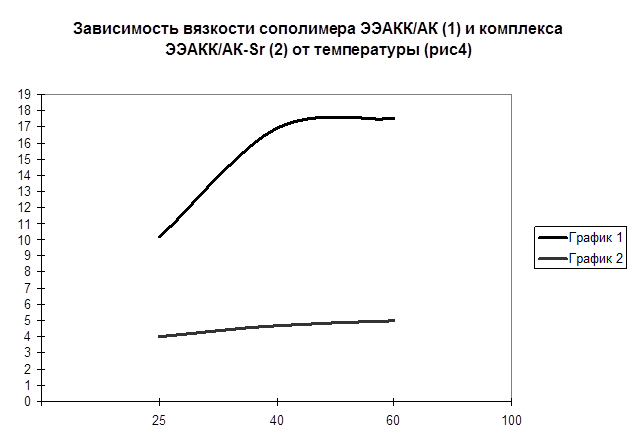 На рис. 4 приведена температурная зависимость вязкости сополимера ЭЭАКК/АК и комплекса ЭЭАКК/АК-Sr2+. Как видно из рисунка при повышении температуры вязкость раствора ЭЭАКК/АК возрастает, что обусловлено ослаблением гидрофобного взаимодействия. (Кривая 1) Следствием этого является разворачивание молекулы сополимера. Кривая (2) показывает влияние температуры на вязкость комплекса ЭЭАКК/АК-Sr2+. С ростом температуры наблюдается незначительное увеличение вязкости. При 80 0С вязкость исследовать не удалось вследствие выпадения комплекса в осадок. По сравнению с вязкостью сополимера вязкость комплекса имеет низкие значения, что свидетельствует об устойчивости полимер-металлического комплекса к воздействию температуры.