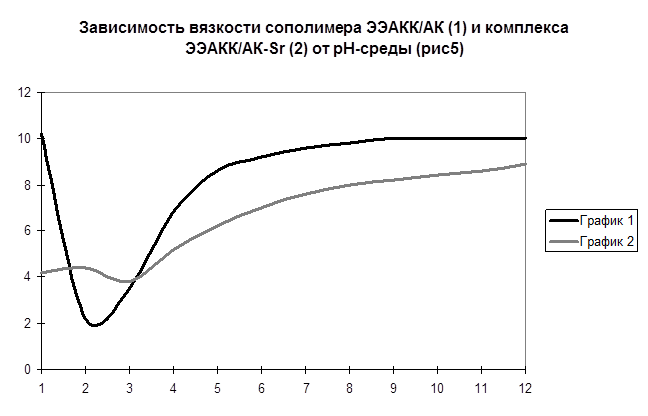 На рис. 5 показано влияние pH-среды на вязкость сополимера ЭЭАКК/АК и комплекса ЭЭАКК/АК-Sr2+. Так как ЭЭАКК/АК является полиамфолитом, то в зависимости от pH-среды он может вести себя как поликатион или полианион. Значение pH раствора полиамфолита, при котором средний суммарный заряд на цепи равен нулю, называется изоэлектрической точкой (ИЭТ). Как известно вязкость полиамфолита в ИЭТ минимальна. Так как вязкость сополимера минимальна в области, pH 2-2,5 то предположительно ИЭТ находится в этой области (рис. 1). Кривая (2) показывает, что в присутствии ионов стронция область ИЭТ выражена незначительно и смещена в сторону pH 3,0. Вязкость комплекса в этой области превышает вязкость самого сополимера. При дальнейшем увеличении pH вязкость комплекса падает, что вероятно связано со связыванием ионов металла полиамфолитом при определенных значениях pH и частичным высвобождением их в области ИЭТ из-за сильного электростатического притяжения между противоположно заряженными участками цепи.