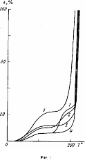 Рис. 1. Кривые термомеханического анализа образца ПЭУМ в исходном состояния (1) и образцов, предварительно прогретых в режиме термомеханического анализа (без наложения груза) до 150 (2), 170 (3), 190 (4) и 210° (£). После прогревания образцы подвергали закалке в жидком азоте. Постоянная нагрузка 0,32 МПа, скорость нагревания ~3 град/мин
