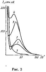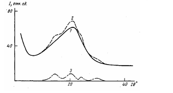 Рис. 5. Зависимость интенсивности рентгенозского рассеяния от величины утла 20: 1 — исходное состояние; 2 — после нагревания до 190°; 3 — разностная кривая, соответствующая рассеянию от кристаллических областей