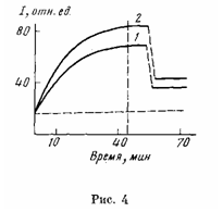 Рис. 4. Интенсивность рентгеновского рассеяния под фиксированным углом 29=40' ' в зависимости от времени для образца ПЭУМ в ходе его нагревания от комнатной температуры до 170 (1) и 190° (2) и выдерживания при указанных температурах. Показаны также уровни / после охлаждения образцов