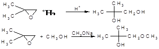 В цих реакціях, як і в загалі завжди, нуклеофіл атакує більш заміщений атом вуглецю при розщепленні, що каналізується кислотами, та менш заміщений атом карбону при розщепленні, що каналізується основами [4].