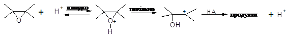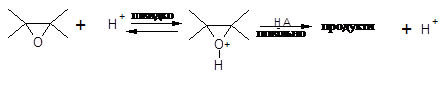 Прітчард та Лонг вивчали кінетику та співвідношення отриманих продуктів реакції гідролізу алкілзаміщених оксидів етилену у кислому середовищі [7]. Виходячи з кореляції між константами швидкості та функції Гамету Н0, вони зробили висновок, що реакція протікає за механізмом А1 .