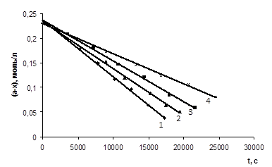 | t, c | (а-х), М | у, % | kсп ·107, с-1 | kсп ·107, л/моль· с |