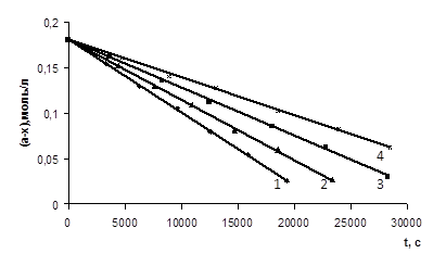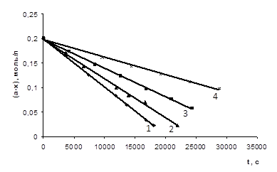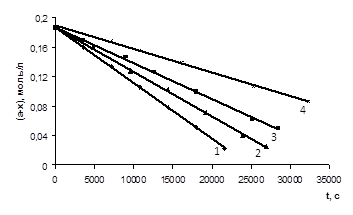 Таблиця 3.15 — Кінетика реакції (СН3 )3 ССООН (а=0,170 М)з ЕХГ (b=12,52 М) у присутності каталізатора (C2 H5 )4 NBr (m=0,005М)