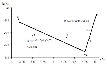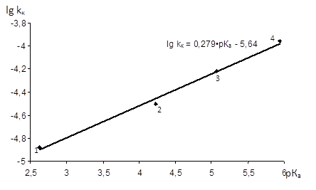 4. При введенні в молекулу оцтової кислоти електронодонорних замісників спостерігається зменшення швидкості реакції із збільшенням кислотних властивостей карбонової кислоти на відміну від замісників електроноакцепторного характеру, де, навпаки, спостерігається збільшення швидкості реакції із збільшенням кислотних властивостей кислотного реагенту.